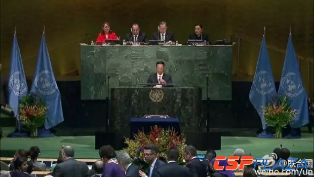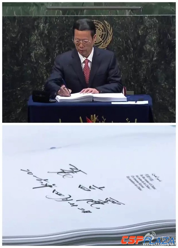 圖:中國國務院副總理張高麗作為習近平主席特使在《巴黎協定》簽署儀式上發言。(來自@聯合國官方微博)