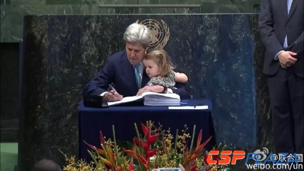 溫馨一刻:美國國務卿克里抱著自己的孫女上臺,代表美國在《巴黎協定》上簽字。(來自@聯合國官方微博)