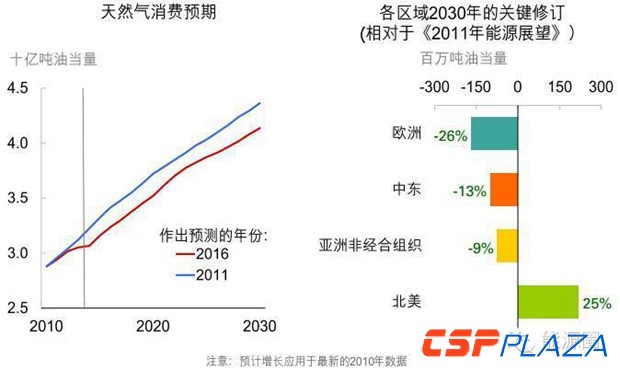 相比于2011年的《展望》,2030年的天然氣預計消費量降低了大約5%(-2.3億噸油當量),歐洲、中東和亞洲非經合組織國家的天然氣需求顯著下調。