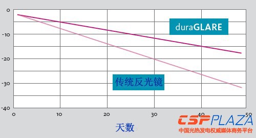 FLABEG公司研發部門項目經理Felix Schwarberg表示,帶duraGLARE涂層的反光鏡對光熱電站開發商的吸引力可以通過相關的數據證明。據德國宇航中心(DLR)的權威測算,對于一個50MW的光熱電站來說,反光鏡每增加一個百分點的反射率,就相當于節約70萬歐元的費用支出。帶duraGLARE涂層的反光鏡的平均反射率可提高2%,這對光熱電站開發商來說將極具吸引力。