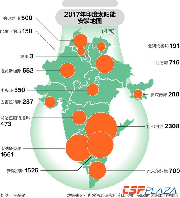 特倫甘納(Telangana)、卡納塔卡(Karnataka)和泰米爾納德(TamilNadu)將會在2017年見證到最多的太陽能裝機增量,三地新增的裝機總量將會超過全年總量的三分之一。