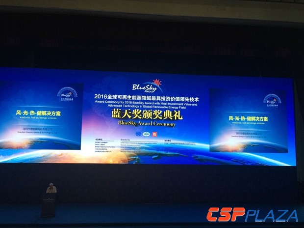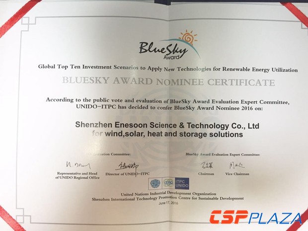 經過初審、復審和多輪現場答辯陳述等嚴格評選,2016年度全球可再生能源領域最具投資價值的領先技術藍天獎終于塵埃落定。深圳愛能森“風-光-熱-儲解決方案”項目在眾多申報技術中脫穎而出,成為全球20項入圍藍天獎候選技術之一,并獲得2016年度“全球可再生能源領域最具投資價值的領先技術藍天獎提名獎”。這是藍天獎首次接受以可再生能源解決方案形式進行申報,說明可再生能源從核心技術,核心產品擴充到可再生能源解決方案的重要性。