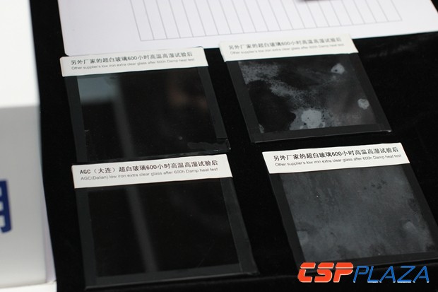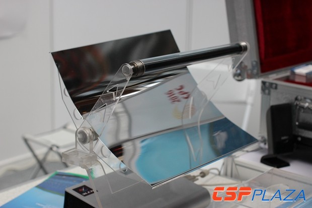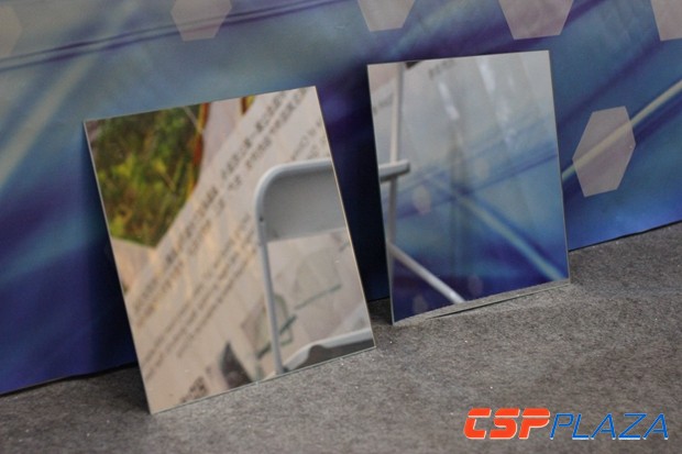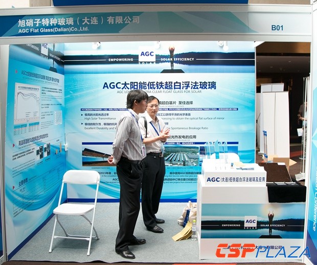 位于B1展位的旭硝子特種玻璃(大連)有限公司在本次大會上帶來了用于光熱發電反射鏡的低鐵超白浮法玻璃,作為光熱行業的活躍對象,AGC已多次參與CSPPLAZA組織的線下活動,此次展出的產品采用世界尖端浮法玻璃技術制造,針對太陽能光熱光伏發電應用領域做了特別的工藝優化,產品可廣泛應用于塔式、槽式、線性菲涅爾、碟式反射鏡玻璃基板,據AGC方面介紹,截止2015年底,全球已完成的CSP項目裝機容量約4.94GW,使用AGC低鐵超白玻璃的聚光反射鏡至少占60%。