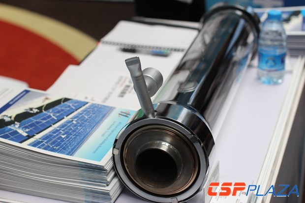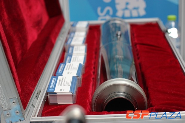 說起集熱管,那絕對不能不提此次大會B11展位謀殺菲林無數的“超長尺寸集熱管”,此款長度5360mm、內吸收管管徑90mm的集熱管是國內領先的光熱發電主產品制造商和光場EPC集成商常州龍騰光熱科技股份有限公司于2015年9月份正式發布的一款適用于導熱油傳熱工質的大尺寸集熱管產品,這也是龍騰光熱首次在國內整管公開展出該產品,該款集熱管的尺寸設計將可匹配龍騰光熱最新研發的大開口槽式集熱器,進一步提高集熱管和集熱器的光學吸收效率并降低槽式集熱系統的成本。