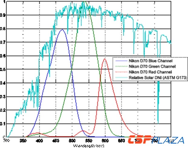 該應用中DSLR選擇的是尼康D90,雖然我們沒有D90的光譜響應函數,但圖3中有D70的光譜響應函數的測量,并且有ASTMG-173作為太陽光譜的參照。
