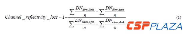 用清潔的區域圖像的平均像素除以污染區域圖像的平均像素來計算反射率的損失。亮燈的圖像扣除之前對應的黑燈的圖像,結果被合并成一個對應顏色信道的平均測量值,如下列等式所示: