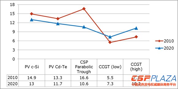 從圖2可以看出,2010年,晶硅電池光伏發電的LCOE為14.9美分/kwh,銻化鎘薄膜電池光伏發電LCOE為13.3美分/kwh,而光熱發電的LCOE為16.6美分/kwh,高出最便宜的光伏發電24.81%,而預測到2020年,光熱發電的LCOE將降至10.6美分/kwh,成本優勢超過光伏。