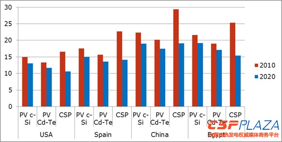 圖5:2010年~2020年四國PV-CSP的LCOE對比 (單位:美分/kwh)