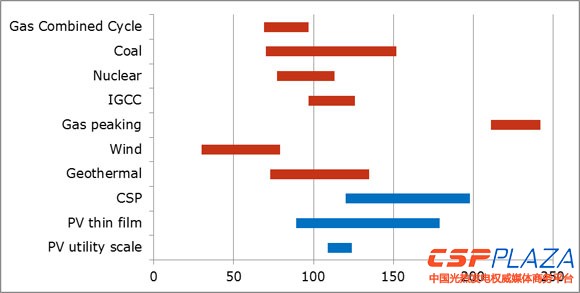 有多家研究機構一直以來關注著這兩種技術的LCOE,下圖1顯示了2008年美國市場各種發電技術的LCOE(紅色和藍色小方塊指出了不同發電技術在多種因素影響下的最高LCOE和最低LCOE)。