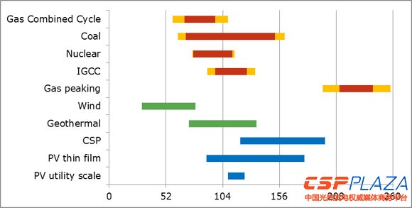 上述研究在計算光伏發電的LCOE時,考慮了晶硅電池(c-Si)和銻化鎘薄膜電池(Cd-Te)兩種技術路線,光熱發電則以最為普及的槽式技術為例,同時參照了燃氣聯合循環發電(CCGT)的LCOE(分別設想了CCGT最低成本和最高成本兩種情景模式)。