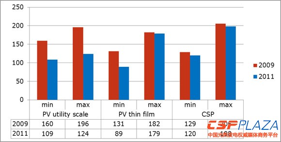 圖8:2009年和2011年PV-CSP的LCOE對比(單位$/MWH,注:上圖被遮住的數字為206,198)