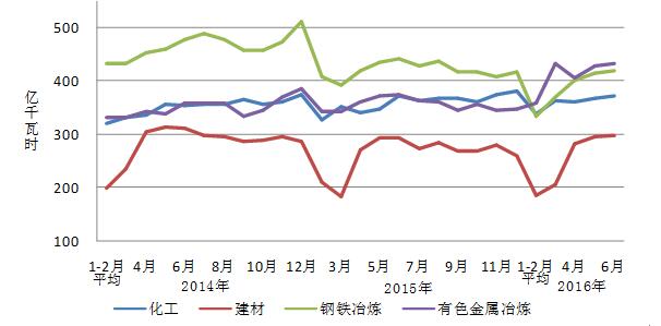 1-6月份,化學原料制品、非金屬礦物制品、黑色金屬冶煉、有色金屬冶煉四大高載能行業用電量合計8310億千瓦時,同比下降3.3%,增速比上年同期回落1.8個百分點;合計用電量占全社會用電量的比重為29.9%,對全社會用電量增長的貢獻率為-39.3%。其中,化工行業用電量2145億千瓦時,同比增長3.6%,增速比上年同期提高1.4個百分點;建材行業用電量1452億千瓦時,同比下降0.8%,增速比上年同期提高5.6個百分點;黑色金屬冶煉行業用電量2277億千瓦時,同比下降9.4%;增速比上年同期回落2.9個百分點;有色金屬冶煉行業2436億千瓦時,同比下降4.3%,增速比上年同期回落9.6個百分點。