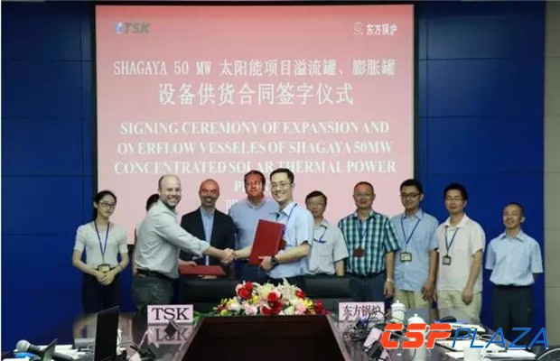 7月21日下午,東方鍋爐股份有限公司(簡稱“東方鍋爐”)與西班牙TSK公司簽訂科威特SHAGAYA50MW太陽能項目溢流罐、膨脹罐設備供貨合同。這是該公司首個自營出口、自主設計(采用ASME規范)的太陽能容器設備,對公司容器及新能源產業發展具有里程碑式的意義。TSK公司項目技術負責人Mr.AntonioBlanco、采購經理Mr.JoseManuelRodriguez;監造公司AEI代表Mr.RaúlGonzález等一行四人;東方鍋爐副總經理唐勇、容器市場部、產品項目管理部等部門負責人出席簽字儀式。