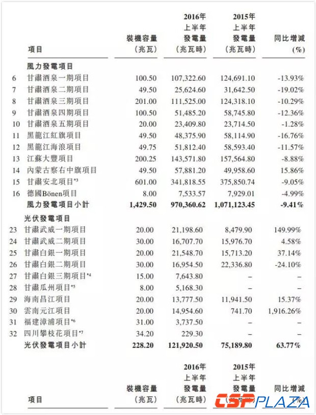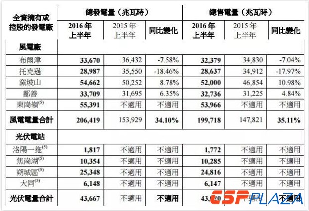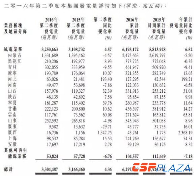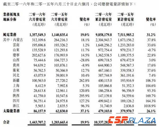 截至2016年6月底,完成總發電量10,337,282.8兆瓦時,較2015年同期增長31.0%。其中,風電發電量為9,858,179.8兆瓦時,較2015年同期增長31.2%,太陽能發電量為479,103.0兆瓦時,較2015年同期增長26.1%。