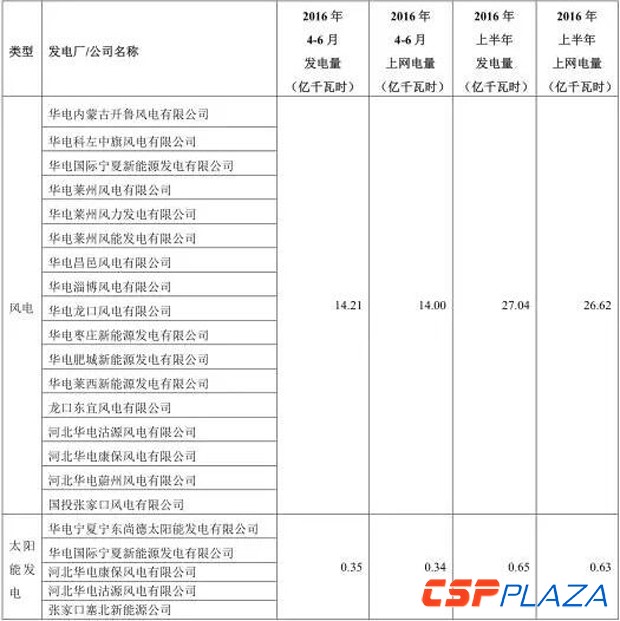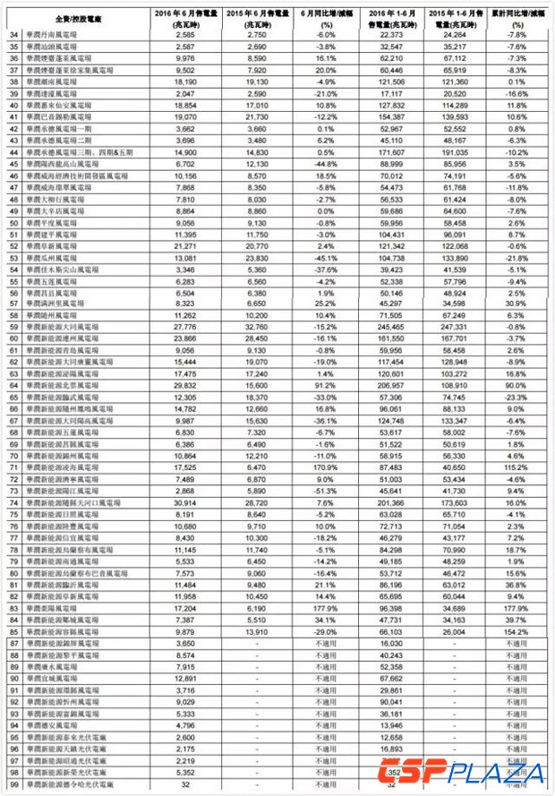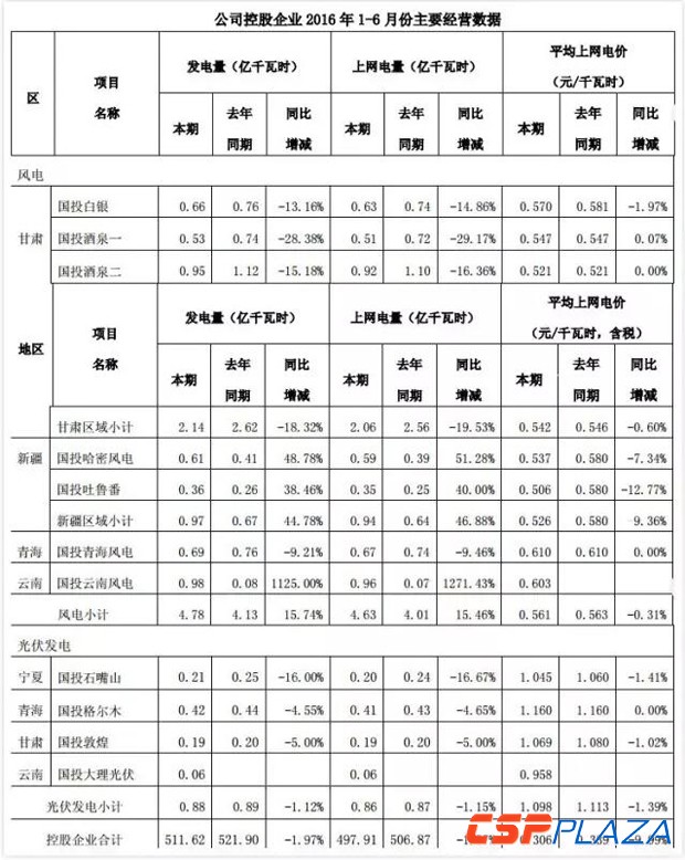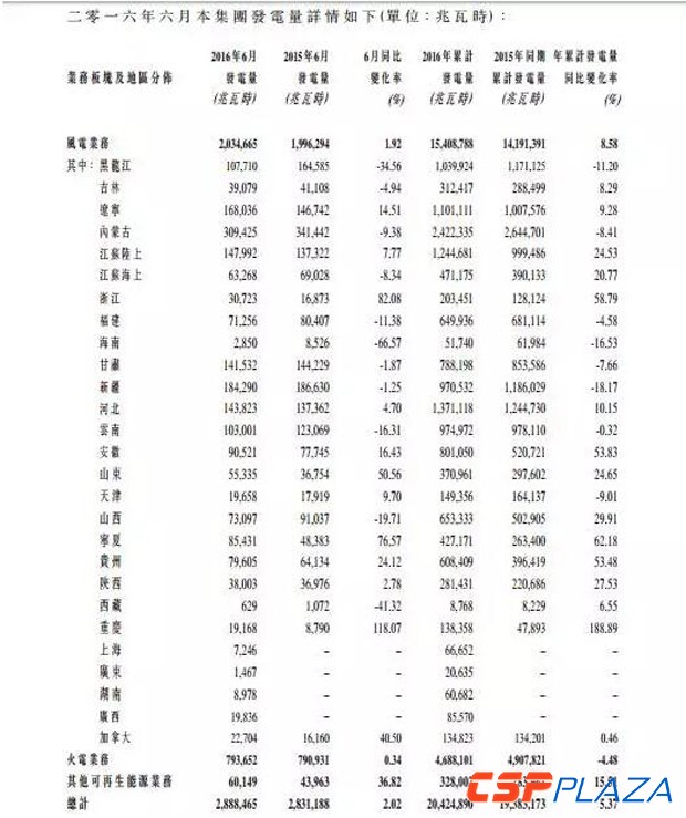 2016年6月完成總發電量1,443,707.2兆瓦時,較2015同期增長19.9%。其中,風電發電量為1,357,549.3兆瓦時,較2015年同期增長19.0%,太陽能發電量為86,157.9兆瓦時,較2015年同期增長37.1%。