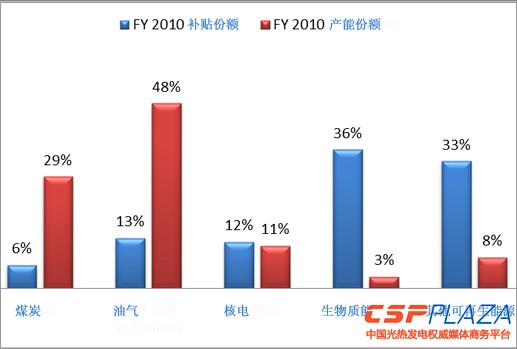 圖:2010財年各類能源補貼及產能份額(來源:EIA)