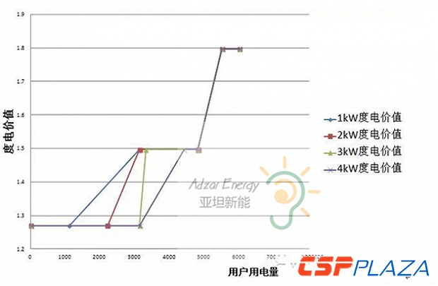 按上述假設,且由于階梯電價的存在,光伏電站的發電量將隨住宅用電量的不同而處于不同的階梯電價下(見圖二)。