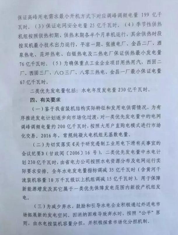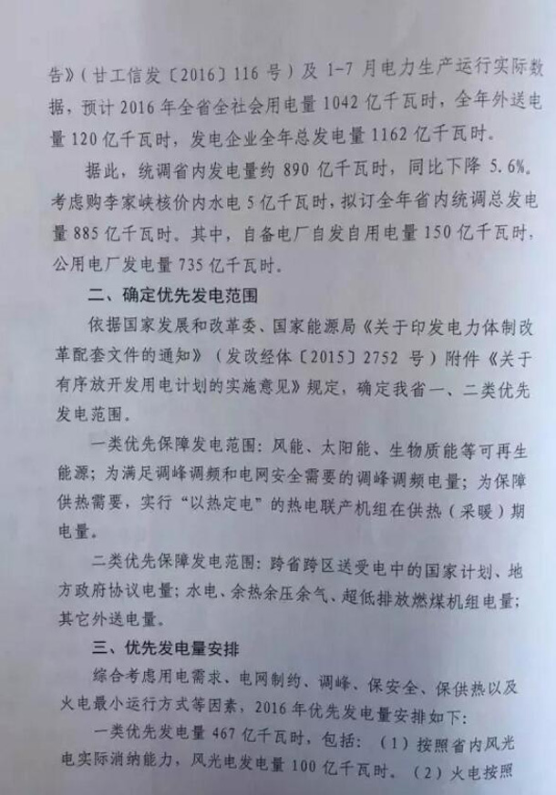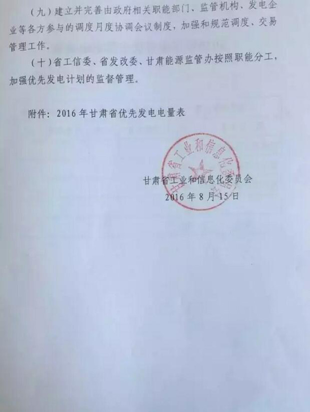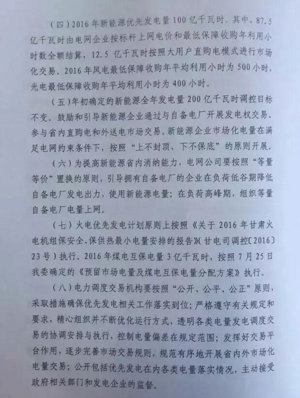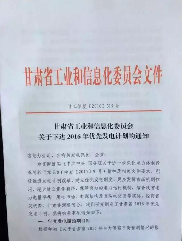 CSPPLAZA光熱發電網訊:甘肅工信委日前發布《關于下達2016年優先發電計劃的通知》,通知明確指出,2016年甘肅光伏保障收購年利用小時數只有400小時,風電為500小時,而此前國家能源局、發改委下達的《關于做好風電、光伏發電全額保障性收購管理工作的通知》規定,甘肅一類地區1500小時,二類地區1400小時。這兩者的額度相差甚遠,地方政府與國家政府文件出現不符。