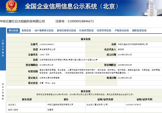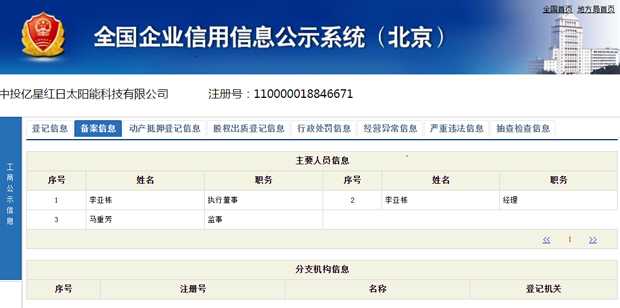 經本公司核實,中投億星新能源投資有限公司與馬重芳教授于2015年3月31日合資設立了中投億星紅日太陽能科技有限公司,其中馬重芳教授持有40%的股權并出任監事一職。中投億星新能源投資有限公司企業信息如下: