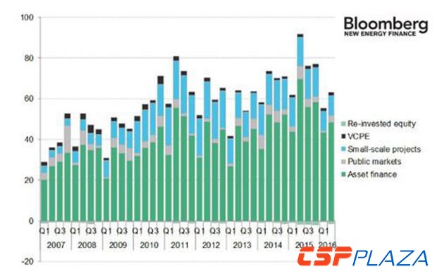 從BNEF的最新數據來看2016年截至目前的趨勢,第一季度和第二季度的數字加起來的上半年投資為1164億美元,同比減少23%。