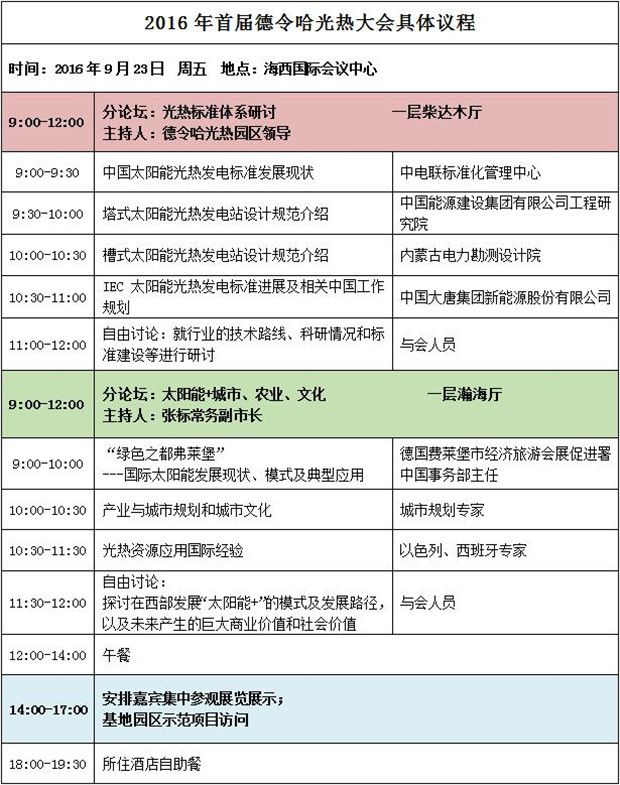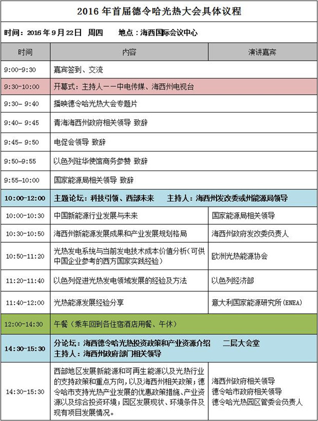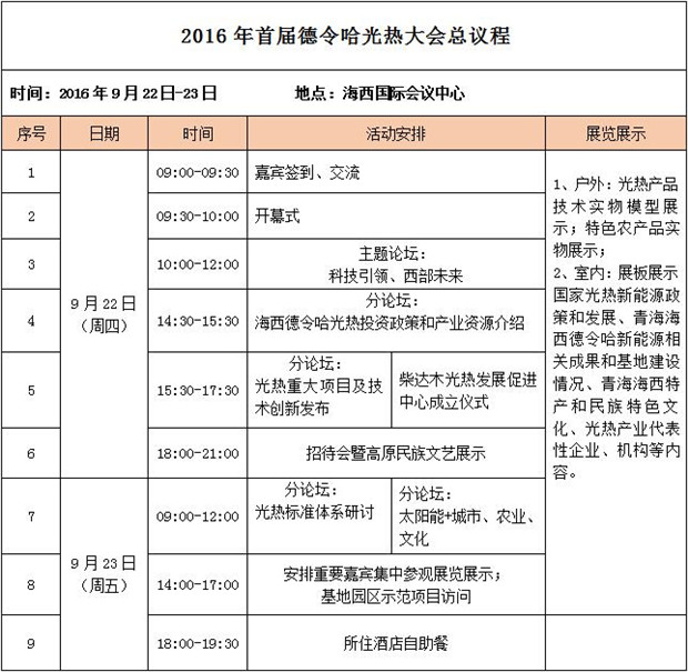 近日,由青海省海西州人民政府、青海省能源局主辦,青海省德令哈市人民政府、中國電力發展促進會承辦,將于9月22~23日在海西州德令哈市召開的主題為“聚焦清潔能源高地,打造世界光熱之都”的2016首屆德令哈國際光熱大會的最終議程已經確定。