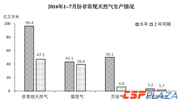 產量大幅增長。7月份,非常規天然氣產量12.4億立方米,同比增長74.5%。1-7月份,非常規天然氣產量96.4億立方米,增長104.8%,其中,頁巖氣產量50.1億立方米,增長7.3倍。頁巖氣產量大幅增加是拉動非常規天然氣產量快速增長的主要原因。