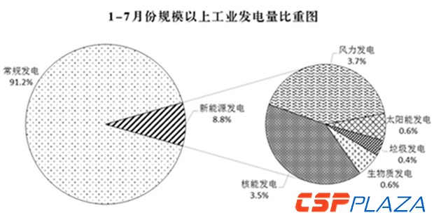 新能源發電量比重不斷提高。1-7月份,新能源發電量占全部發電量的比重為8.8%,比上年同期提高1.3個百分點。核電、風電和太陽能發電占全部發電量比重分別為3.5%、3.7%和0.6%,分別比上年同期提高0.6、0.4和0.1個百分點。