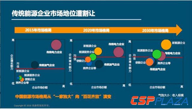 傳統電力企業在能源市場上處于一家獨大,傳統的電力企業無非是兩個電網公司、五大發電或者六大發電,還有傳統的油氣行業,中石化、中石油、中海油。但是從長遠來看,到2030年,這個格局就會發生不一樣的變化。新能源企業增長潛力會超過傳統能源企業,能源服務企業、使能企業、跨界企業,也在憑借能源互聯網領域帶來的商業機會迅速崛起,甚至會趕超油氣產業。埃森哲預測到2030年將呈現百花齊放的局面,而不是幾家獨大。