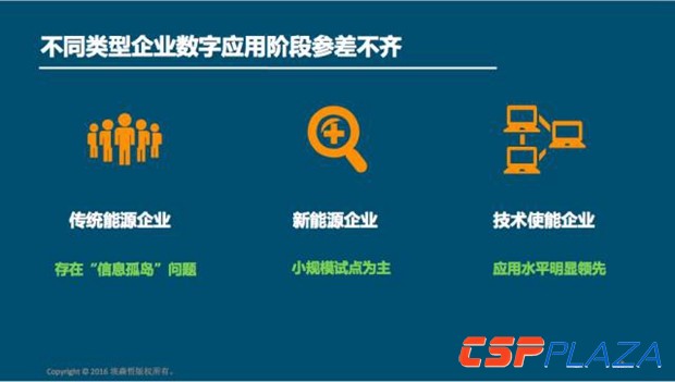 埃森哲把現在的能源類企業分成了三大類,傳統的能源企業、新的能源企業、技術使能類的企業,這三種類型的企業目前數字化應用水平是參差不齊的。