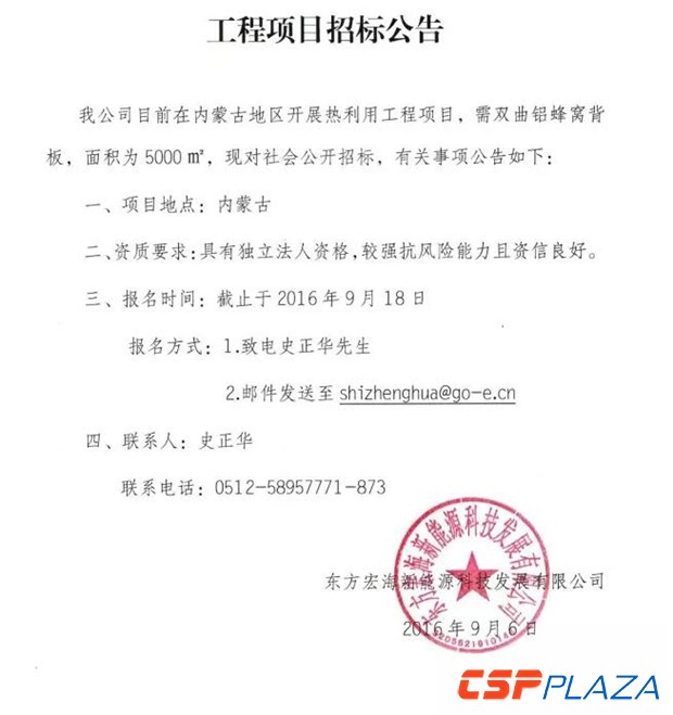 東方宏海內蒙光熱利用項目雙曲鋁蜂窩背板招標