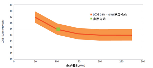 從上圖可以看出,從目前的技術情況分析來看,最佳的槽式CSP電站的裝機規模約在220MW左右,這將使其LCOE有明顯程度的降低,達到平衡的最佳臨界點。
