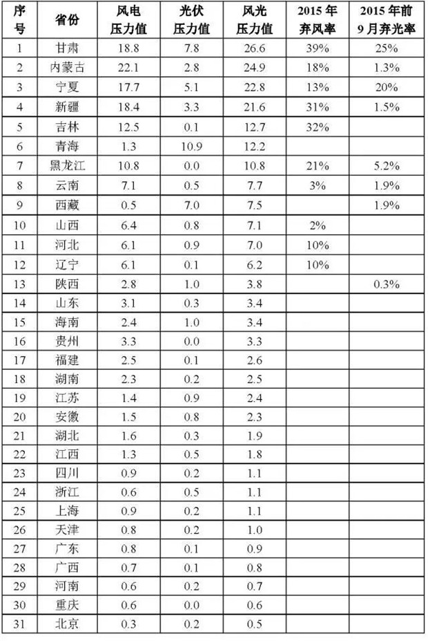 從上表可以看出,甘肅、內蒙古、新疆、寧夏4個省份的風光壓力值已經超過20,即風電、光伏項目的發電量已經占到該省用電量20%以上,限電壓力已經非常大,2015年的限電比例也非常大。