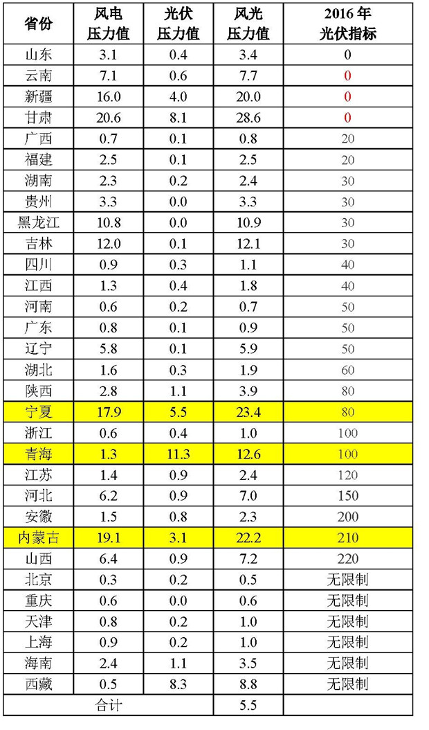 從上表可以看出,壓力值較小的省份,2016年基本為規模指標無限制;壓力值比較大的省份,2016年的規模指標基本為0。然而,內蒙古、寧夏、青海等省份的壓力值較大,2016年的規模指標也比較大,在這些省份投資,尤其要注意限電壓力。