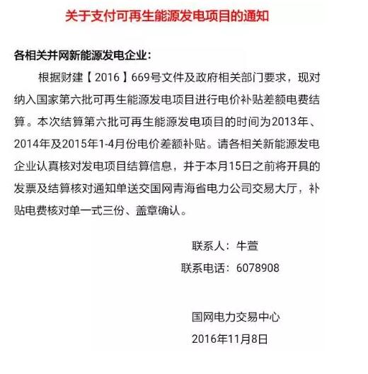 11月8日,國家電力交易中心向青海新能源企業下發的《關于支付可再生能源發電項目的通知》(下稱“通知”)明確,計劃對納入國家第六批可再生能源發電項目進行電價補貼差額電費結算。同時《通知》要求,相關新能源企業在11月15日前將開具的發票及結算核對通知單送交青海國網交易大廳。