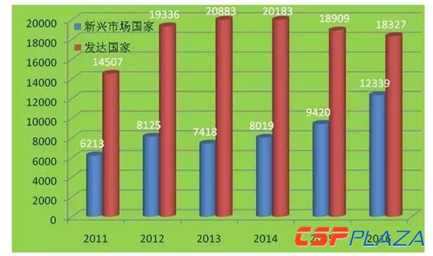 與此相反的是新興市場國家企業總營業收入則是呈現先減少后增加模式,并在2013達到一個低點后開始增加,并呈加速趨勢。