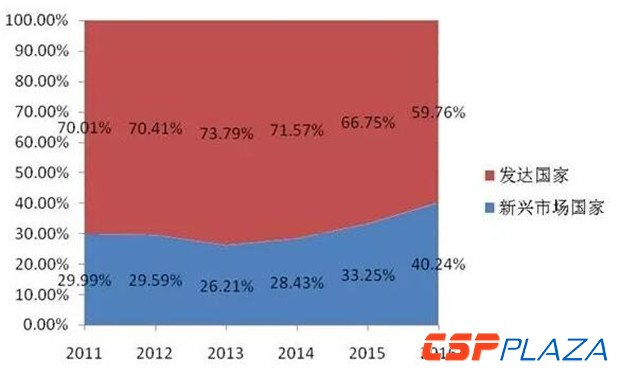 上圖則給出了2011-2016“500強”企業中新興市場國家與發達國家企業總營業收入占比情況。此圖更直觀的印證了上述趨勢。