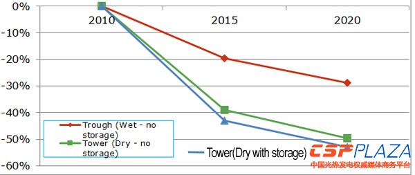 圖表1指出了2010年~2020年十年間,各種CSP技術的成本下降趨勢。從中可以看出,采用水冷冷卻且無儲熱的槽式技術預計到2015年成本將下降20%,而采用空冷冷卻且配置儲熱的塔式技術成本將下降53%。