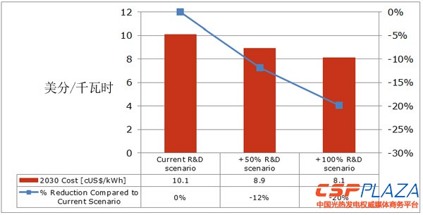 圖表2顯示,在當前的研發情景(指對光熱發電技術研發的政策支持、研發機構和研發項目的數量和質量等整體的研發環境)下,光熱發電成本在2030年可降至10.1美分/千瓦時,而在增加50%的研發情境下,預期到2030年可降至8.9美分/千瓦時,若增加100%的研發情境,預期到2030年可降至8.1美分/千瓦時。