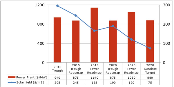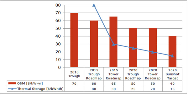 圖表3和圖表4展示了美國能源部SunShot計劃給出的當前成本和預期成本。其中2010年的成本數據是基于一個100MW的無儲熱槽式電站作出的計算,2015年的成本預測是基于一個250MW的帶6小時儲熱的槽式電站和一個100MW的熔鹽作傳熱介質的帶6小時儲熱的塔式電站作出的計算。