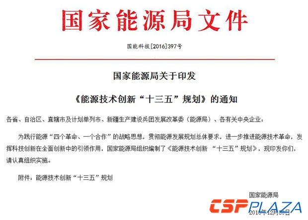 CSPPLAZA光熱發電網訊:近日,國家能源局印發《能源技術創新“十三五”規劃》( 以下簡稱《規劃》)。作為可再生能源的重要分支,光熱發電在《規劃》中被重點提及。