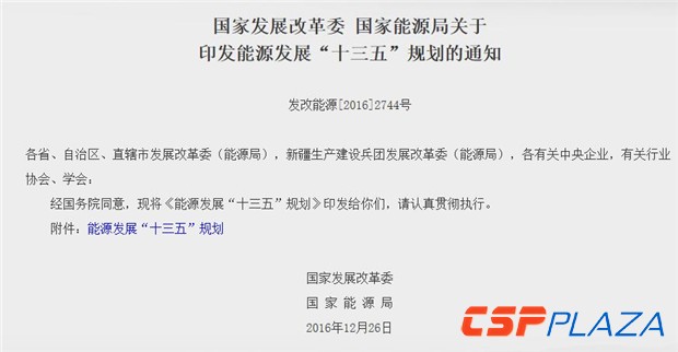1月17日,國家發展改革委和國家能源局聯合發布了《關于印發能源發展“十三五”規劃的通知》,并公開了《能源發展“十三五”規劃》全文。規劃指出,十三五期間要積極推動三北地區的光熱發電產業化發展,到2020年完成光熱發電裝機500萬千瓦。