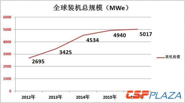 圖:2012~2016年全球總CSP建成裝機(制圖:CSPPLAZA)