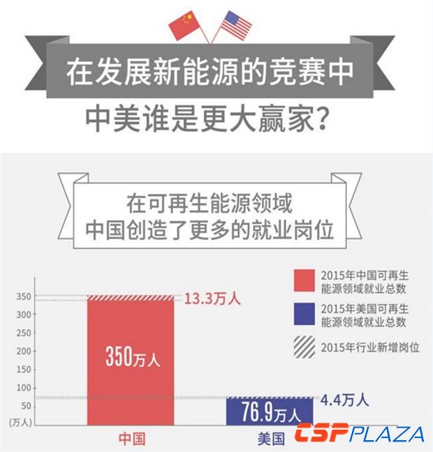 有關中國近年的綠色發展,專注環保的非營利性組織中外對話(China Dialogue)在會前發布相關分析:在可再生能源領域,中國創造了更多的就業崗位。2015年中國可再生能源領域就業總數為350萬人,此一數字在美國為76.9萬人。按照測算,中國可再生能源行業的就業規模在2020年將升至1300萬人,而在美國則將升至100萬人。