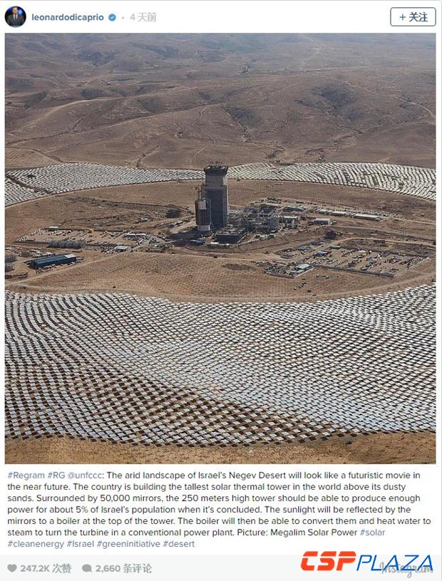 CSPPLAZA光熱發電網訊:2017年1月19日,美國著名影星萊昂納多·迪卡普里奧在其社交網站Instagram上分享了一張以色列Ashalim1光熱電站的圖片。Ashalim1光熱電站目前正處于緊張的建設施工中,建成后有望成為全球最高的塔式光熱電站。