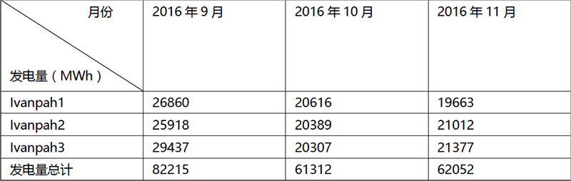 由上表可見,Ivanpah電站在2016年9月的發電量達到82215MWh,而預計的年發電量為975000MWh,平均至各月,則每月需達到的發電量為81250MWh涉及到季節因素,相較于2015年8月~11月的發電量(分別為63135、49469、46262MWh),增長顯著。