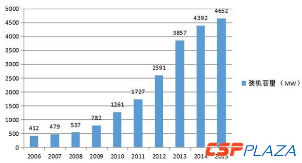 圖:全球太陽能熱發電累計裝機容量(2006~2015年)