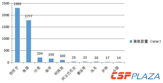 國際可再生能源署(IRENA)統計數據顯示,截至2015年12月底,西班牙在運光熱電站總裝機容量為2300MW,占全球總裝機容量近一半,位居世界第一;美國總裝機量為1777MW,位列世界第二;兩者合計光熱裝機超過4GW,約占全球光熱裝機的88%。其后是印度、南非、阿聯酋、阿爾及利亞、摩洛哥等國。