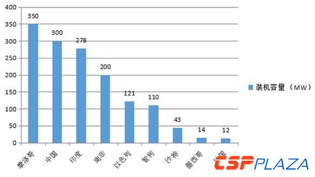 根據國際能源署太陽能熱發電和熱化學組織(SolarPACES)統計,截至2016年2月底,全球在建太陽能光熱發電站裝機容量約1.4GW。其中摩洛哥在建裝機容量最高,達350MW,包括裝機200MW的NOORII槽式光熱電站和裝機150MW的NOORIII塔式光熱電站。中國近幾年也開始發展光熱發電產業,在建裝機容量位居第二位,為300MW(與國內統計數據略有出入)。印度在建項目的裝機容量達278MW,位居第三位,其后是南非、以色列、智利等國。