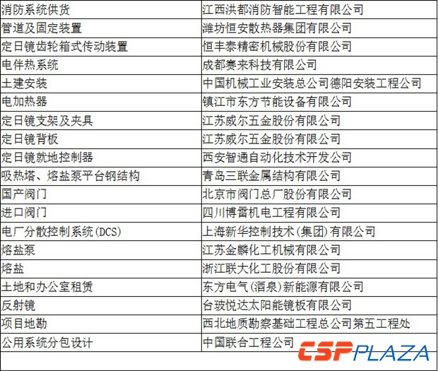 據悉,該項目的相關設備采購工作早在去年8月就已展開。截至目前,部分采購項的中標方已經確定。其中,項目熔鹽泵中標供應商為江蘇金麟化工機械有限公司;反射鏡中標供應商為臺玻悅達太陽能鏡板有限公司;電廠分散控制系統(DCS)將由上海新華控制技術(集團)有限公司提供;項目地勘及項目分包設計工作將分別由西北地質勘察基礎工程總公司第五工程處和中國聯合工程公司負責。具體中標信息可參見下表: