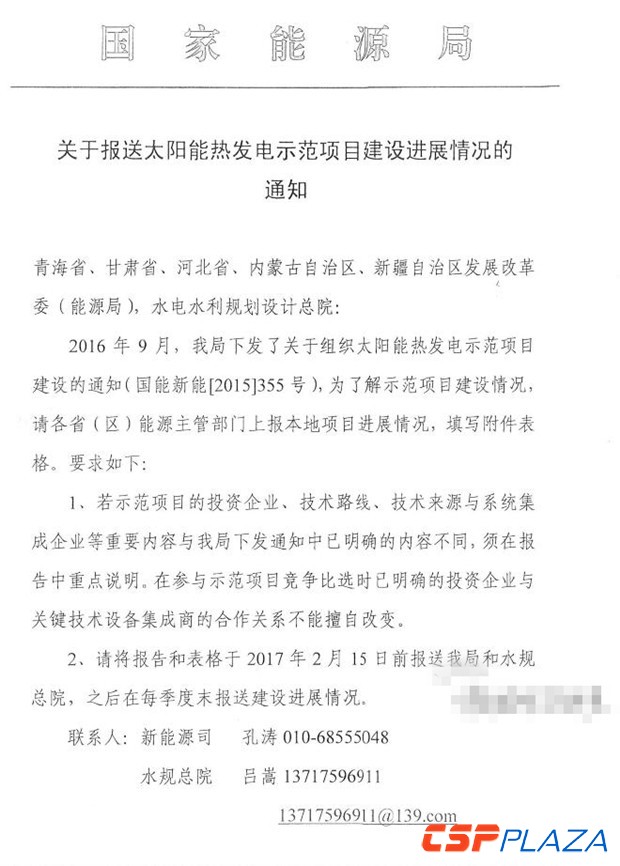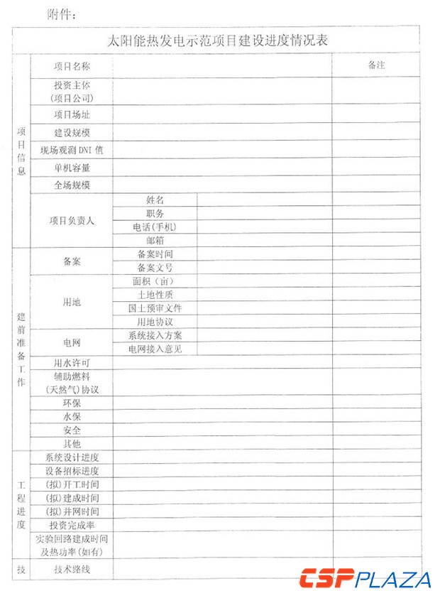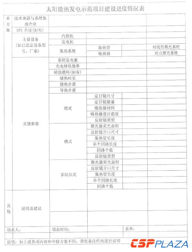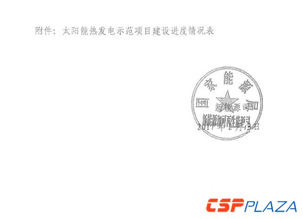 CSPPLAZA光熱發電網訊:近日,國家能源局發布《關于報送太陽能熱發電示范項目建設進展情況的通知》(以下簡稱“通知”)。為了解示范項目建設情況,各省區能源主管部門須上報本地項目進展情況。